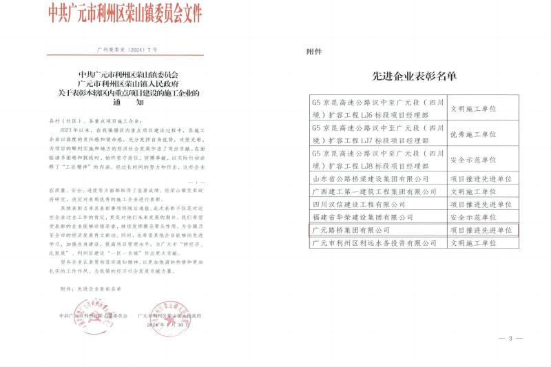 1月30日,公司收到利州區(qū)榮山鎮(zhèn)委員會(huì)、榮山鎮(zhèn)人民政府發(fā)來(lái)的關(guān)于表彰本轄區(qū)內(nèi)重點(diǎn)項(xiàng)目建設(shè)的施工企業(yè)的通知{廣利榮委發(fā)(2024)7號(hào)},路橋集團(tuán)被點(diǎn)名表彰,路橋集團(tuán)榮山鎮(zhèn)高坑口至周家壩項(xiàng)目部在面對(duì)建設(shè)前期諸多困難和挑戰(zhàn)時(shí),迎難而上,發(fā)揚(yáng)拼搏奉獻(xiàn),以實(shí)際精神詮釋了“工匠精神”的內(nèi)涵。